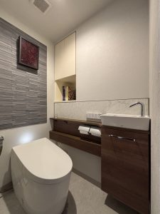 カウンター手洗いにリフォーム。壁にはアクセントとしてエコカラット。